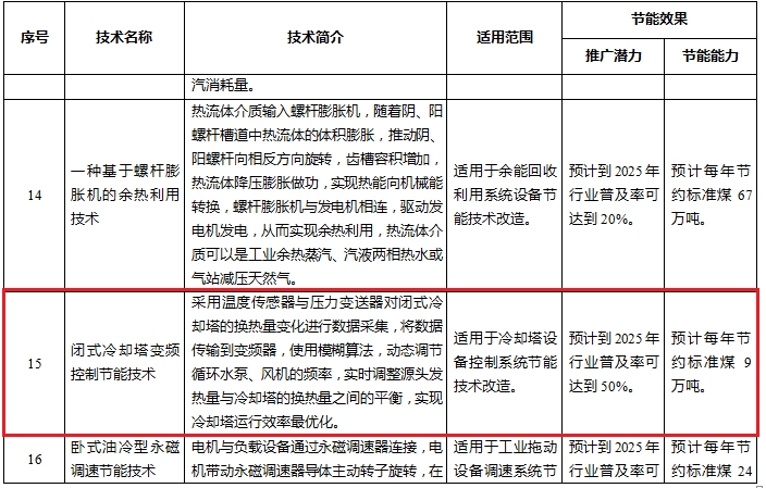 2022年11月,国家工业和信息化部发布《国家工业和信息化领域技能技术装备推荐目录(2022年版)》公告,其中我公司闭式冷却塔变频控制节能技术”成功入选《国家工业和信息化领域技能技术装备推荐目录(2022年版)》,这代表公司的节能核心技术得到国家的认可肯定与支持推广,标志着我公司工业节能综合专业服务能力、技术实施水平又上新台阶,此次成功入选,喜登榜单,为公司后续开拓全国工业节能服务市场奠定基础,持续为用能单位创造技改效益,为国家节能减排事业贡献力量,体现企业社会责任!